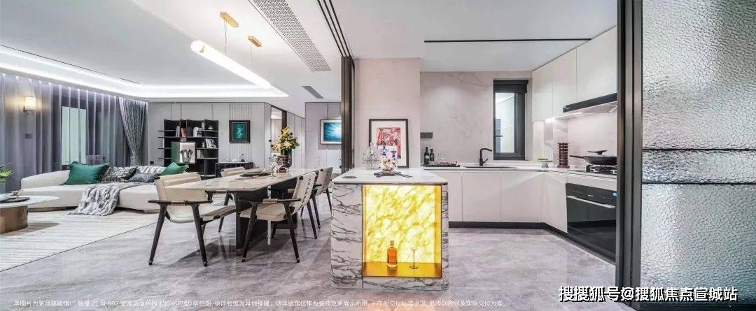厨房所有墙面均采用大面积岩板,并且采用移门处理,水波纹玻璃不仅提升了质感,更减少了室内空间互相之间的阻隔感;