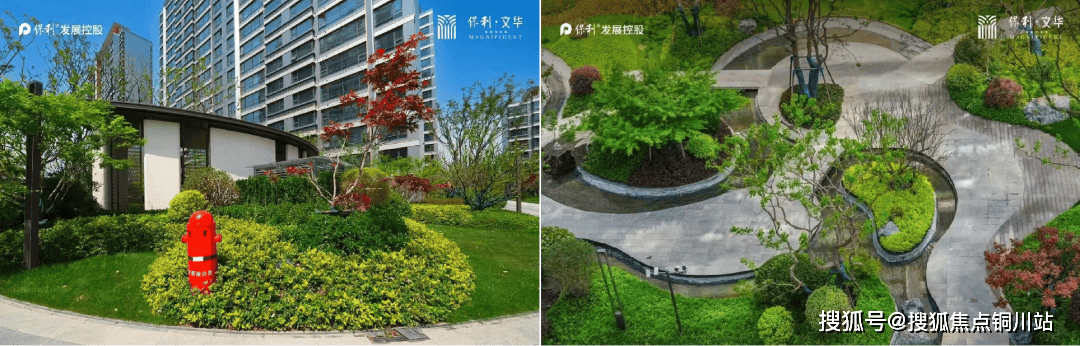 当前正在推进的升级中,如:东门新增龟甲冬青球与穗花婆婆纳打造四季花境,南北轴线替换为更高规格的朴树与樱花,下沉庭院的流水面石材升级为亚光质感,北入口增设造型松与叠级花池......